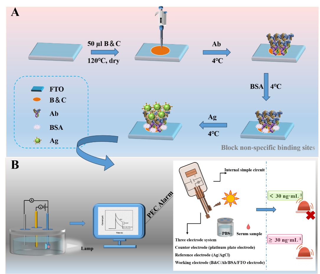 近日,beat365在线体育赵龙山教授和戴荣华教授课题组成功制备了一种基于Bi-MOF和CdS-QDs(B&C)的新型光电化学(PEC)活性材料,构建PEC免疫传感器并应用于CYFRA21-1的定量分析,并结合3D打印技术设计了小型PEC报警器的模型,该PEC免疫传感器已成功应用于血清样本中CYFRA21-1的检测。这项研究为临床癌症的早期筛查工作提供了更广阔的平台。相关成果“Late-model Bi-MOF&CdS-QDs materials: Excellent properties and performance in PEC sensors for lung cancer markers”发表于国际化学权威期刊Chemical Engineering Journal(IF:15.1,DOI: 10.1016/j.cej.2024.151560)。