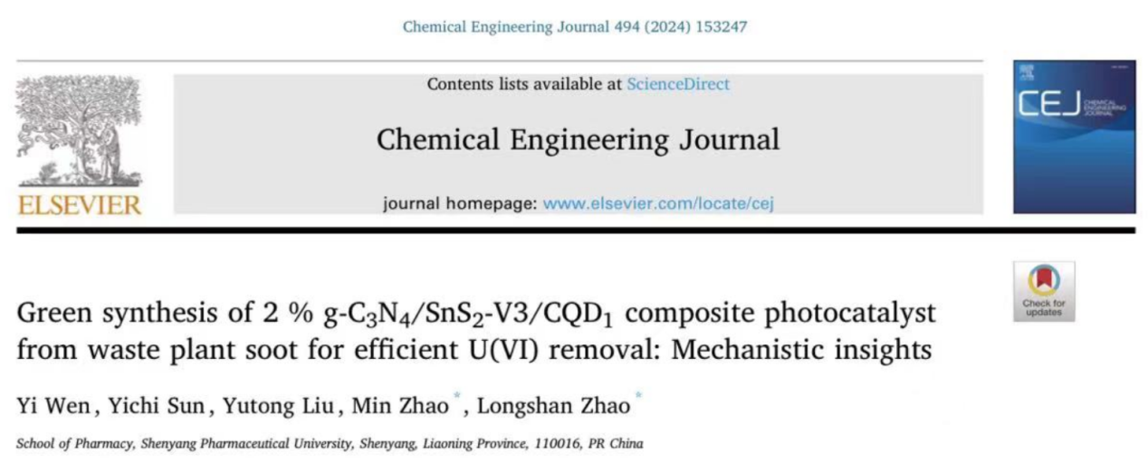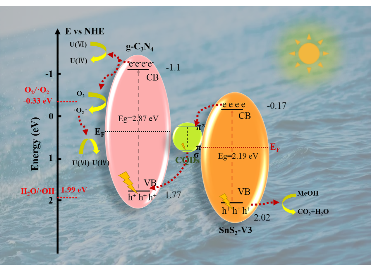 近日,beat365在线体育赵龙山教授和赵旻副教授课题组基于中药百草霜成功设计和构建了Z型2% g-C3N4/SnS2-V3/CQD1光催化体系,实现了U(VI)的光催化去除,该体系表现出高效的去除能力、高效的自然可见光收集能力和良好的上转换性能。以硝酸铀酰六水合物(N2O8U·6H2O)作为放射性元素U(VI)污染物模拟物,通过配比优化评价合成的复合纳米光催化剂的光催化性能,并深入探究了光催化活性增强的机理。这项工作不仅为其他多功能复合光催化剂的构建提供了思路和策略,而且还为解决放射性元素污染提供了一种新方法。相关成果“Green Synthesis of 2% g-C3N4/SnS2-V3/CQD1 composite photocatalyst from waste plant soot for efficient U(VI) removal: Mechanistic insights”发表于国际化学权威期刊Chemical Engineering Journal(IF:13.3,中科院一区,DOI: 10.1016/j.cej.2024.153247)。