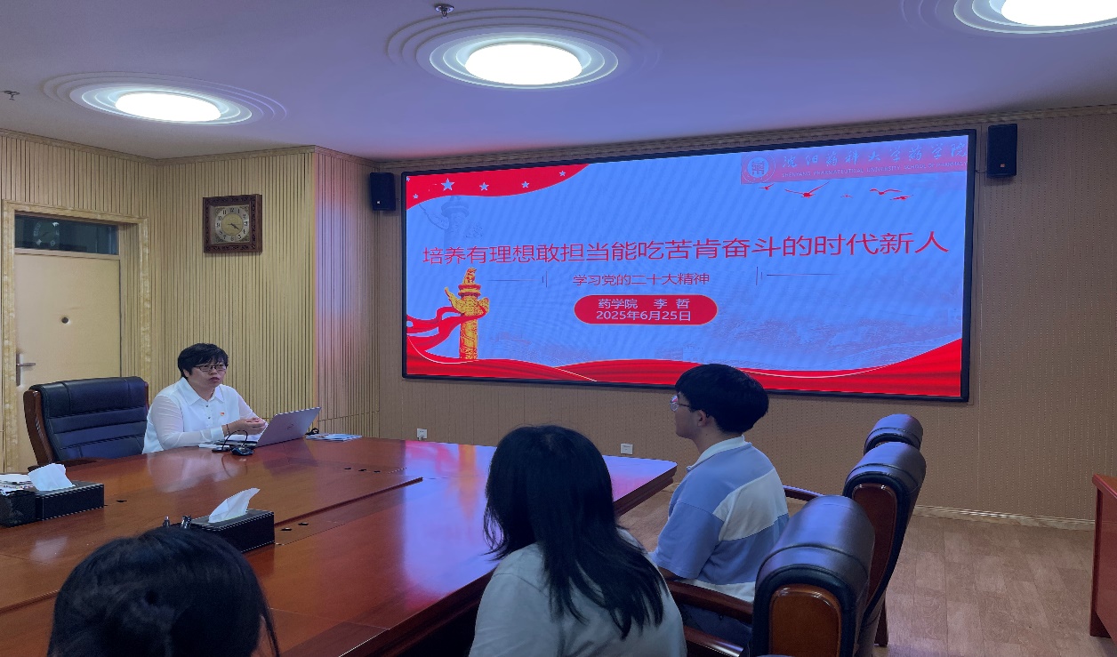 2025年6月25日下午,beat365在线体育党委书记李哲在公司313室为2024级药学(英语)二班同学讲授题为“培养有理想敢担当能吃苦肯奋斗的时代新人”的思想政治课,勉励广大青年员工坚持不懈用习近平新时代中国特色社会主义思想凝心铸魂,鼓励同学们秉持勤学敬业精神,锤炼责任担当品格,融入沈药发展,实现人生价值。