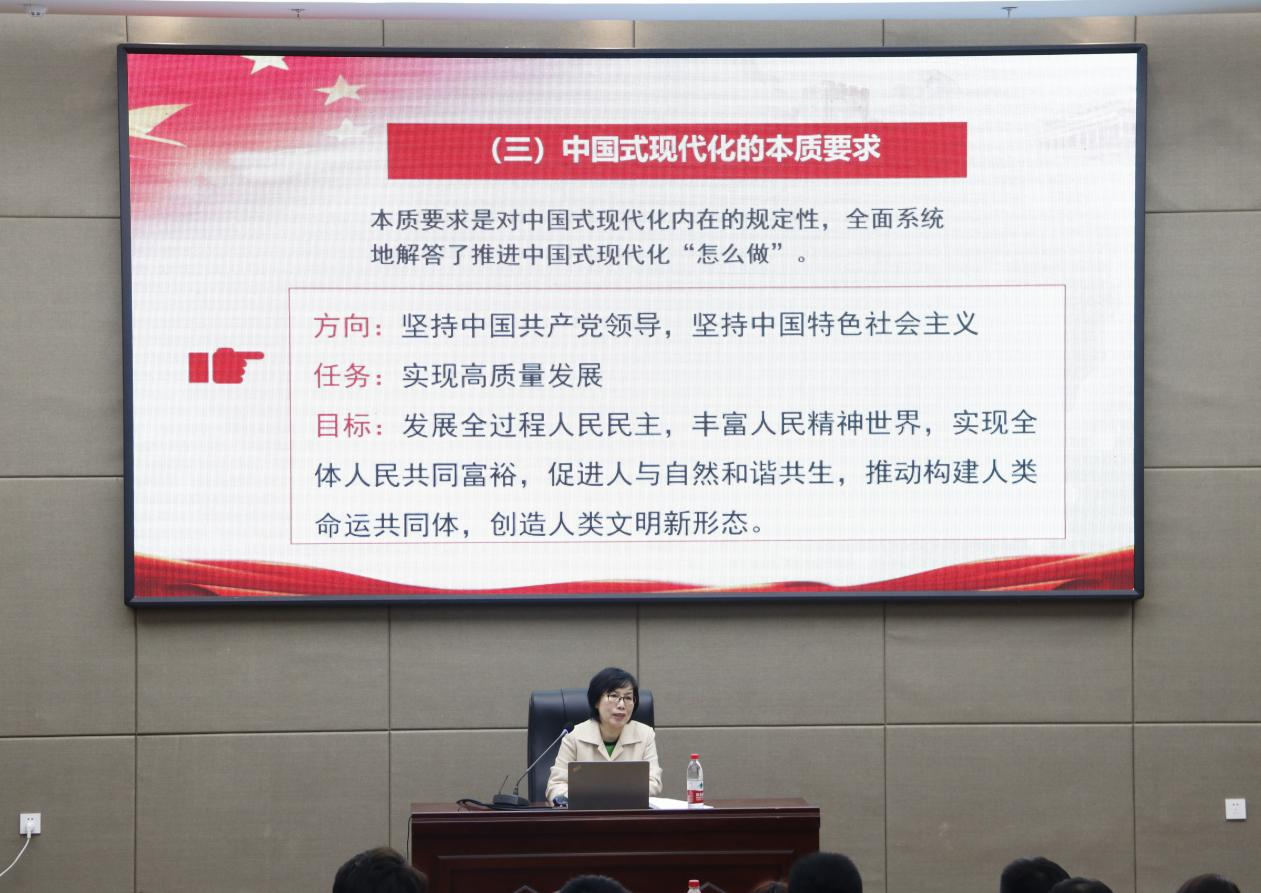 徐雪松教授带来题为“以中国式现代化全面推进中华民族伟大复兴”的报告。她以大会召开的背景为切入点,从中国式现代化的重大意义、中国式现代化的中国特色和本质要求、以推动高质量发展谱写中国式现代化新篇章三部分内容展开讲授,多角度深入解析了党的二十大报告,讲解认真细致,内容深入浅出,引导积极有力,听者受益匪浅。