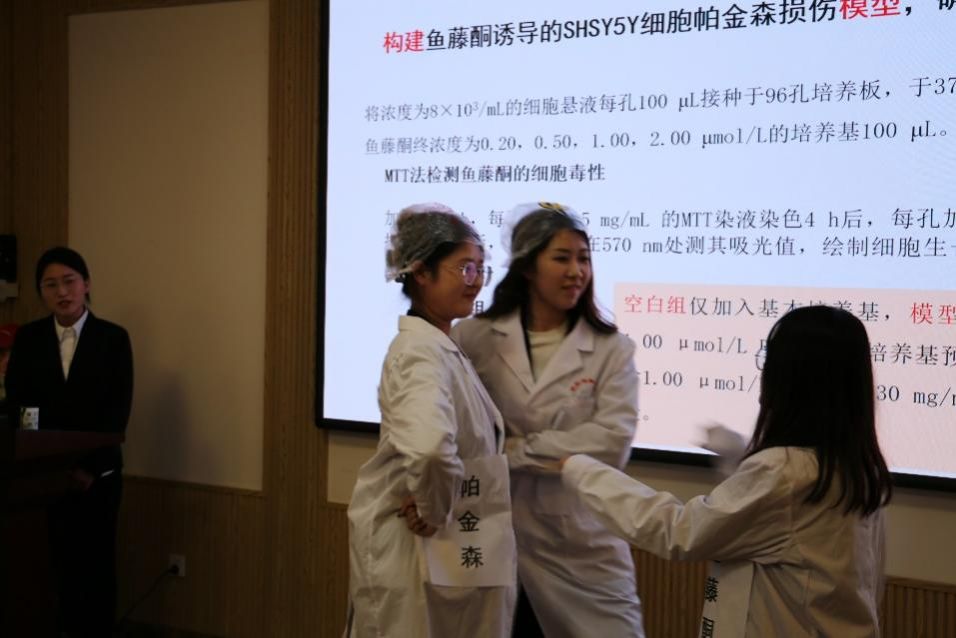 第六组参赛队伍是“仙草奇缘队”,该队的演讲题目是《外泌体对鱼藤酮诱导的SHSY5Y细胞损伤模型的保护作用及机制研究》。演讲人分角色扮演,将实验过程以及外泌体队目标细胞的作用机制以表演形式展示出来,视频与音乐的加入让整场演讲更具生动性。