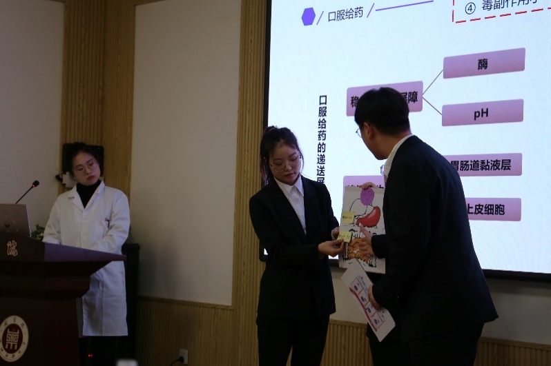 第二组参赛队伍是“加油‘肝’队”,该队的演讲题目是《顺铂和去甲斑蝥素树枝状大分子前药自组装胶束用于肝癌的治疗》。该组选手以医患对话的方式讲述顺铂和去甲斑蝥素树枝状大分子前药自组装胶束在肝癌治疗上的作用,巧妙运用道具为大家介绍肝癌及其新型化疗用药顺铂和去甲斑蝥素注射液,最后提出保护肝脏,从小事做起的呼吁。