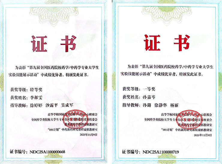 近日,第九届全国医药院校药学/中药学专业老员工实验技能展示活动在南京顺利举行。在公司杨丽教授等老师的精心指导下,员工发挥出色,斩获特等奖1项、一等奖1项,充分彰显了公司卓越的人才培养质量与扎实的育人成效。